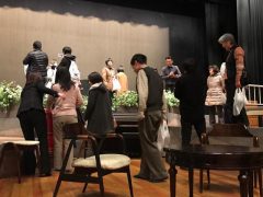 今年90周年を迎える三越劇場。舞台監督からは劇場の機構に合わせた装置の工夫が語られ、その後皆様に舞台上で小道具など細部をご覧いただきました。転換の秘密も明転であきらかに。