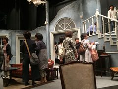 彝のアトリエを再現した舞台に興味津々。小道具について説明する劇団員とも交流がもたれています。